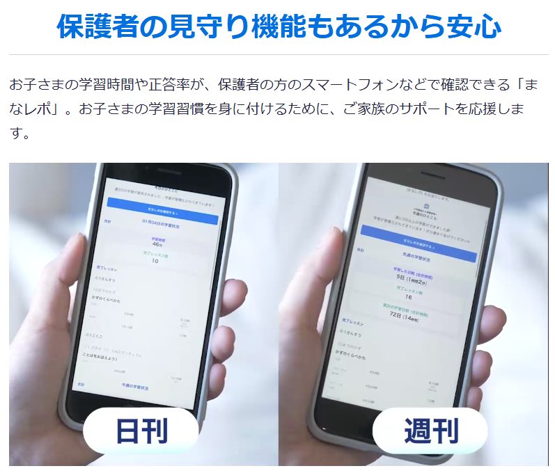 • 保護者が学習状況や理解度を確認できる「まなレポ」という機能があり、学習の進み具合や理解度を把握することができます。