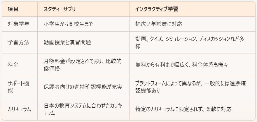 以下にスタディーサプリと一般的なインタラクティブ学習の違いを表にまとめました