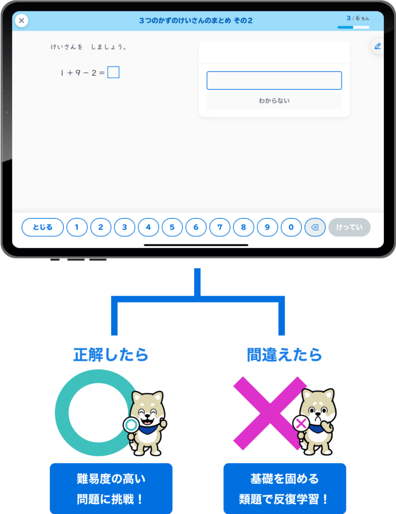 正誤状況に応じて、お子様に適した問題を自動出題!段階的にレベルアップした問題に取り組めるので、着実に学習能力が身につき、学習に対する自信がつきます。